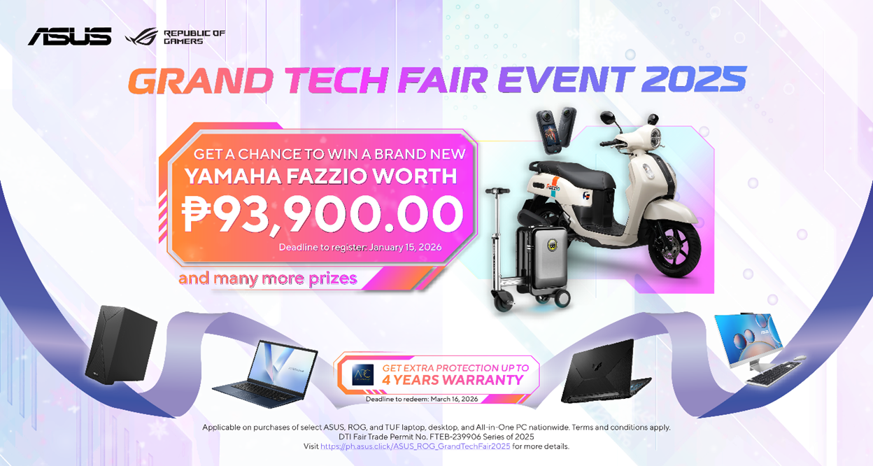 PASIG CITY, Philippines (November 11, 2025) — ASUS and Republic of Gamers (ROG) are powering up the holidays with the ASUS ROG Grand Tech Fair 2025, the biggest gadget sale of the season! From November 14, 2025 to January 15, 2026, enjoy incredible year-end deals on Always Incredible laptops, desktops, and other premium devices. Get an ASUS Premium Care Warranty Extension, experience the exclusive 3-day flash sales and giveaways, and score rebates of up to PHP 5,000 – plus, a chance to win a Yamaha Mio Fazzio!