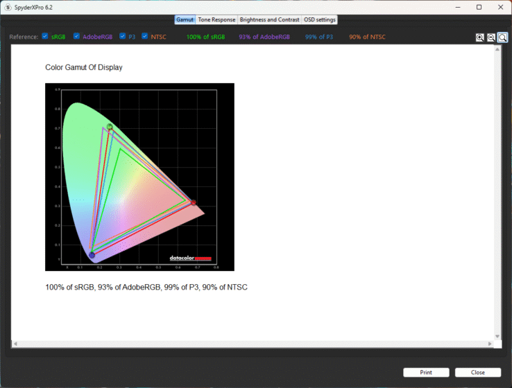 As per testing, it covers at least 100% sRGB, 93% AdobeRGB, 90% NTSC, and 99% P3, which perfectly matches its specifications.