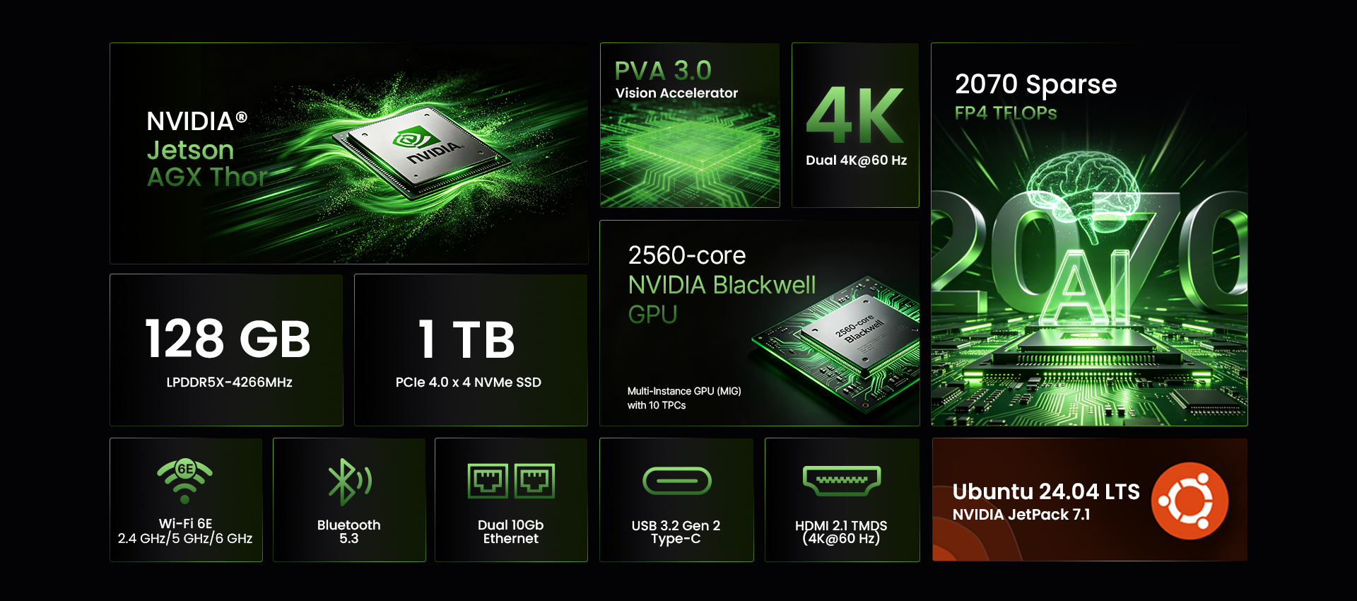 • Pre-installed Ubuntu 24.04 LTS (NVIDIA JetPack 7.1)